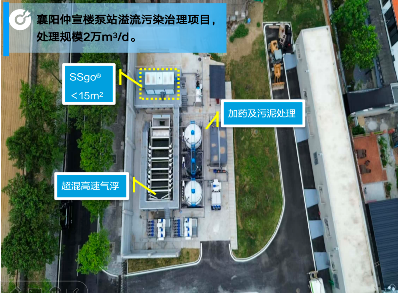 在部分管控更为严苛的地区,为进一步削减溢流污水中的总磷及氨氮,尚川水务采用“SSgo®+超混高速气浮”工艺路线,典型案例就是襄阳仲宣楼泵站溢流污染治理项目。范海涛介绍,仲宣楼是“楚天四大名楼”之一,是襄阳的名片,位于襄阳古城东南角。古城片区内管网雨污混接严重,分流改造难度大。仲宣楼泵站是一座雨污两用合流泵站,流量为3.16立方米每秒,汛期泵站放江水排入护城河,造成水质恶化。在用地极为紧张的条件下,如果要建设调蓄池覆盖全部流量,几乎不可能实现。
